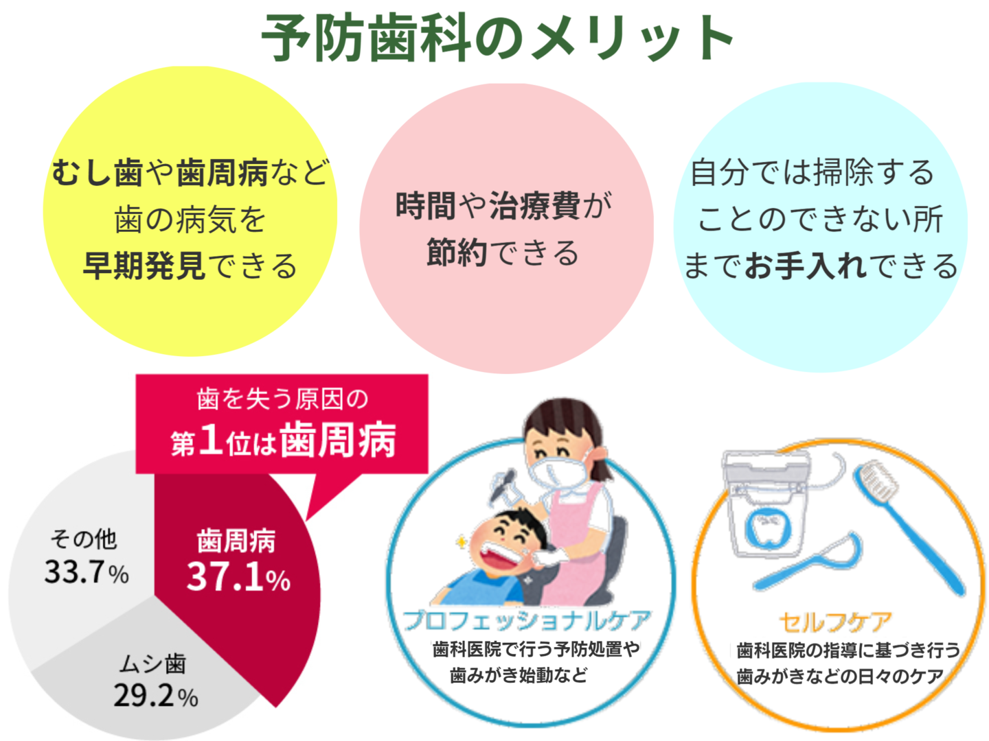 当院では、歯とお口の健康を積極的に守る為に、歯科医院などでの『プロケア(プロフェッショナルケア)』と、歯科医や歯科衛生士の指導に基づいた毎日の『セルフケア』の両方で、予防歯科を実践する事を推奨しています。
