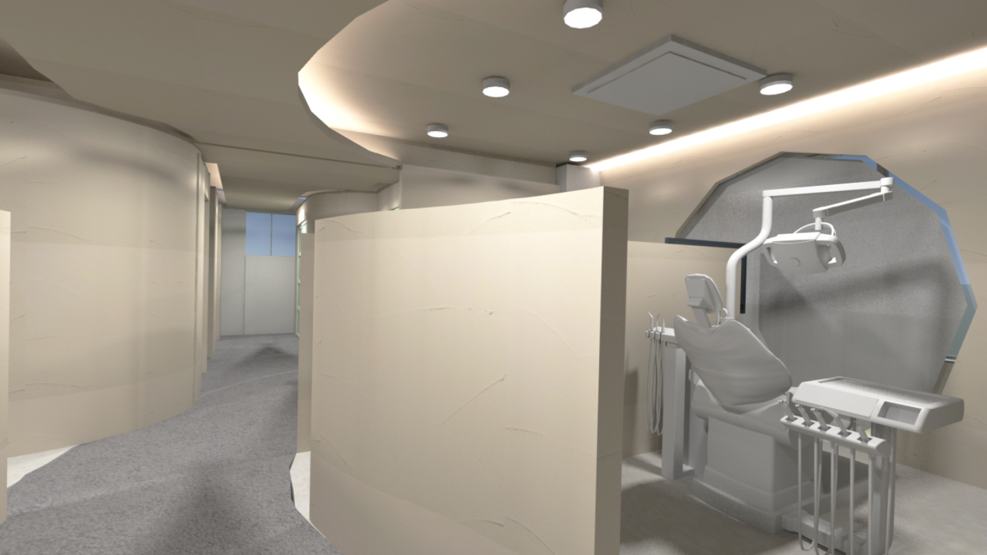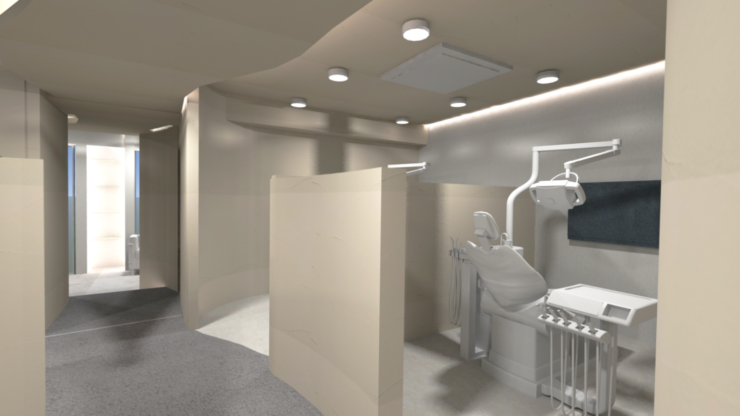 クリニック内は「歯科」を感じさせない雰囲気です。それぞれのチェアは背の高いパーテーションで区切られています。